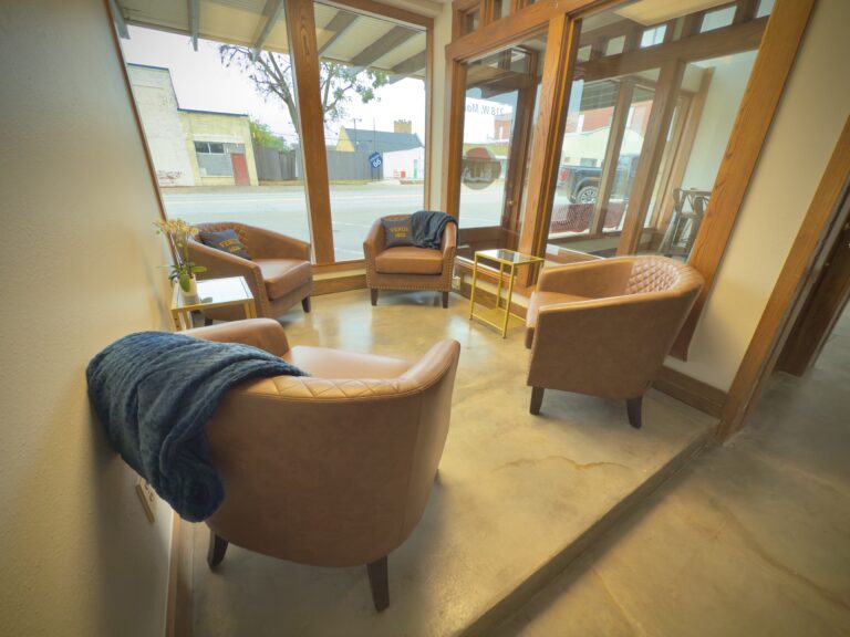 The Route 66 Lounge at Venue 1922 invites guests into one of the most charming event spaces in Stroud, offering a cozy, nostalgic atmosphere that overlooks America’s most iconic highway. With large windows flooding the space with natural light, it’s divided into two inviting seating areas — one featuring rich leather chairs for relaxed conversation and the other with bar-top tables perfect for mingling. It’s an ideal spot to sip a drink, share a story, or take in the view. Historic canvas prints showcasing Stroud from the early 1900s through the rise of Route 66 add a sense of heritage and history, giving guests a true “moment in time” experience before stepping into the Main Hall.